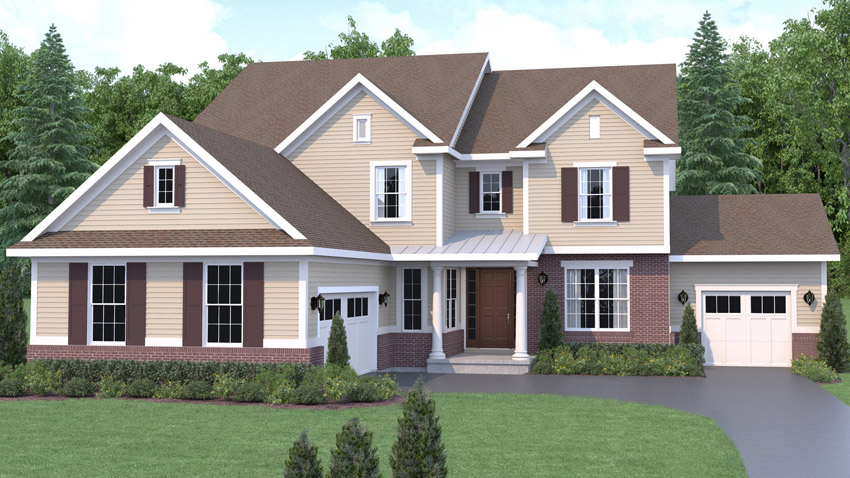 Rendering of Ash Brook floor plan -shows exterior of home from the front. 2 stories French Country