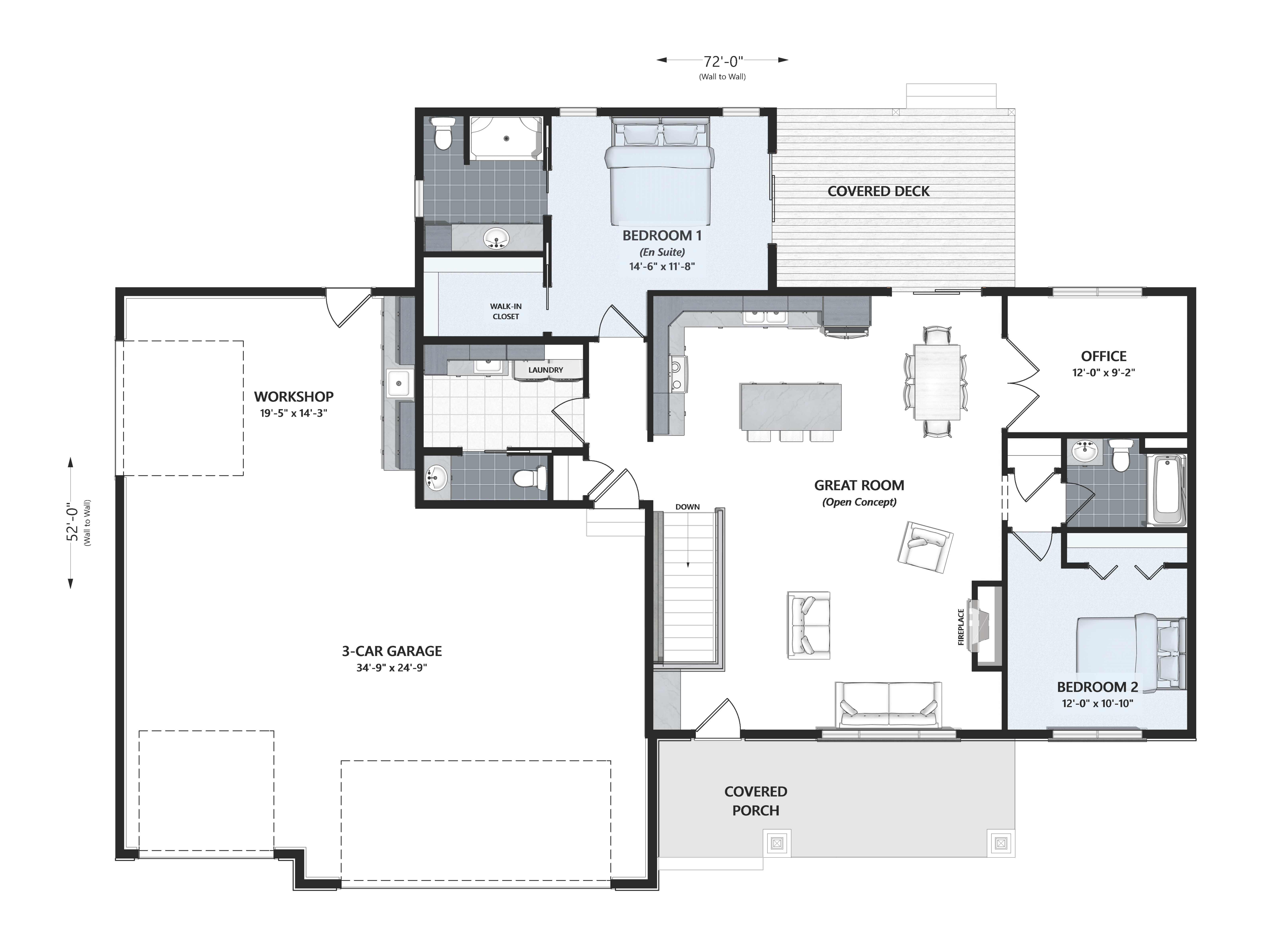 The 1550 sq. ft. of living space plus an additional 1120 sq. ft. of garage space fits neatly on a 72'x52' footprint, giving you design flexibility on city, suburban, or acreage lots.