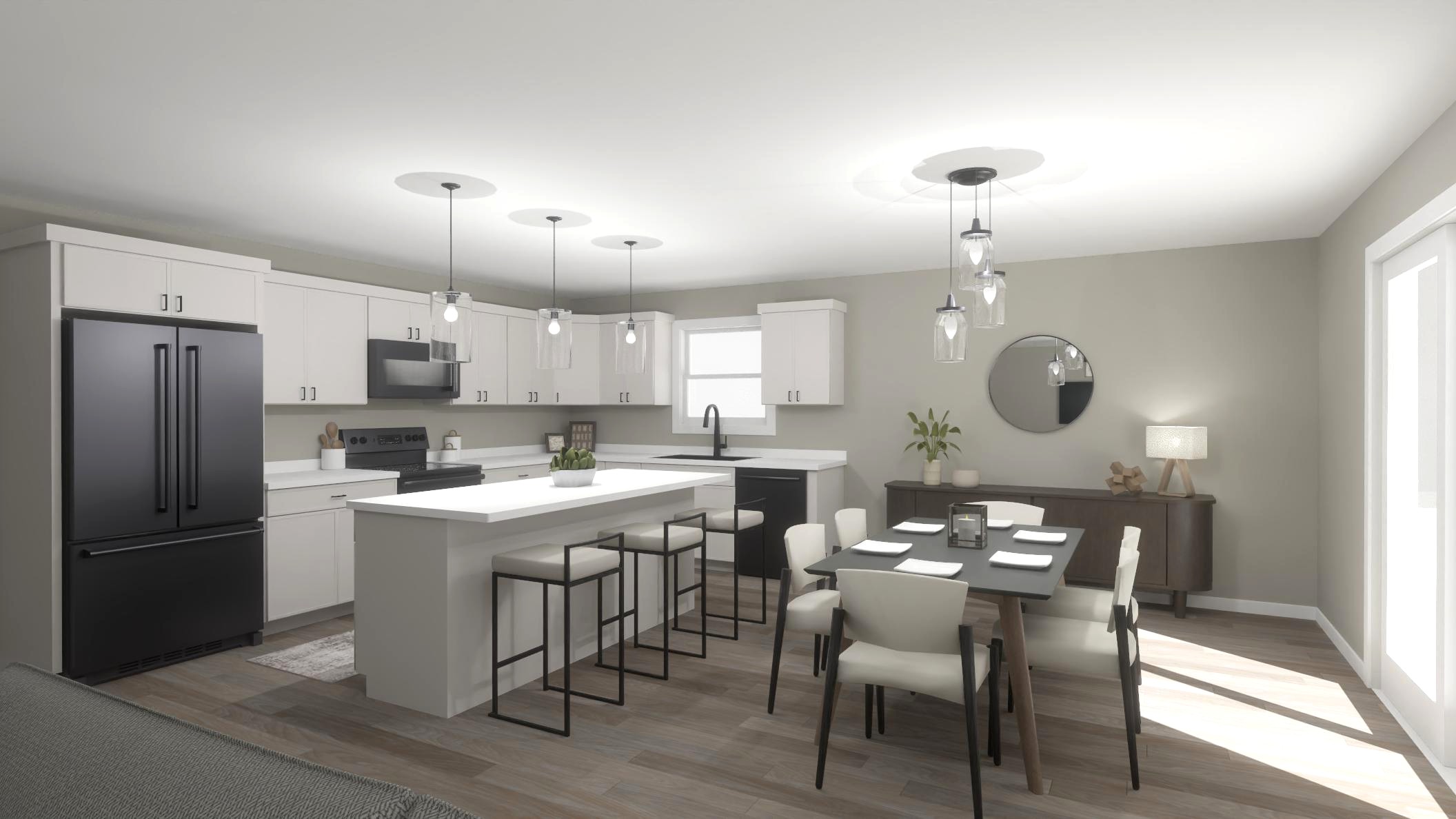 At the center of the plan, the open-concept kitchen, dining, and great room creates a natural gathering space. A spacious kitchen island provides plenty of prep and seating space, and a sliding glass door off the dining area offers easy access to a future patio or backyard.