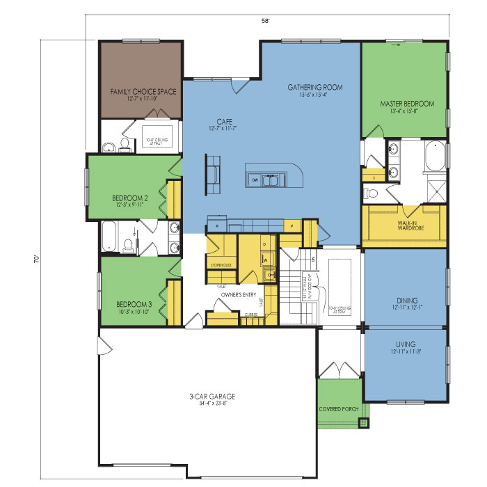 A part of our Designer Series, the Mill Cove floor plan features 3 bedrooms and 2.5 bathrooms with a foot print of 58x70 feet and 2452 total square feet of living space. Floor Plan #DT155
